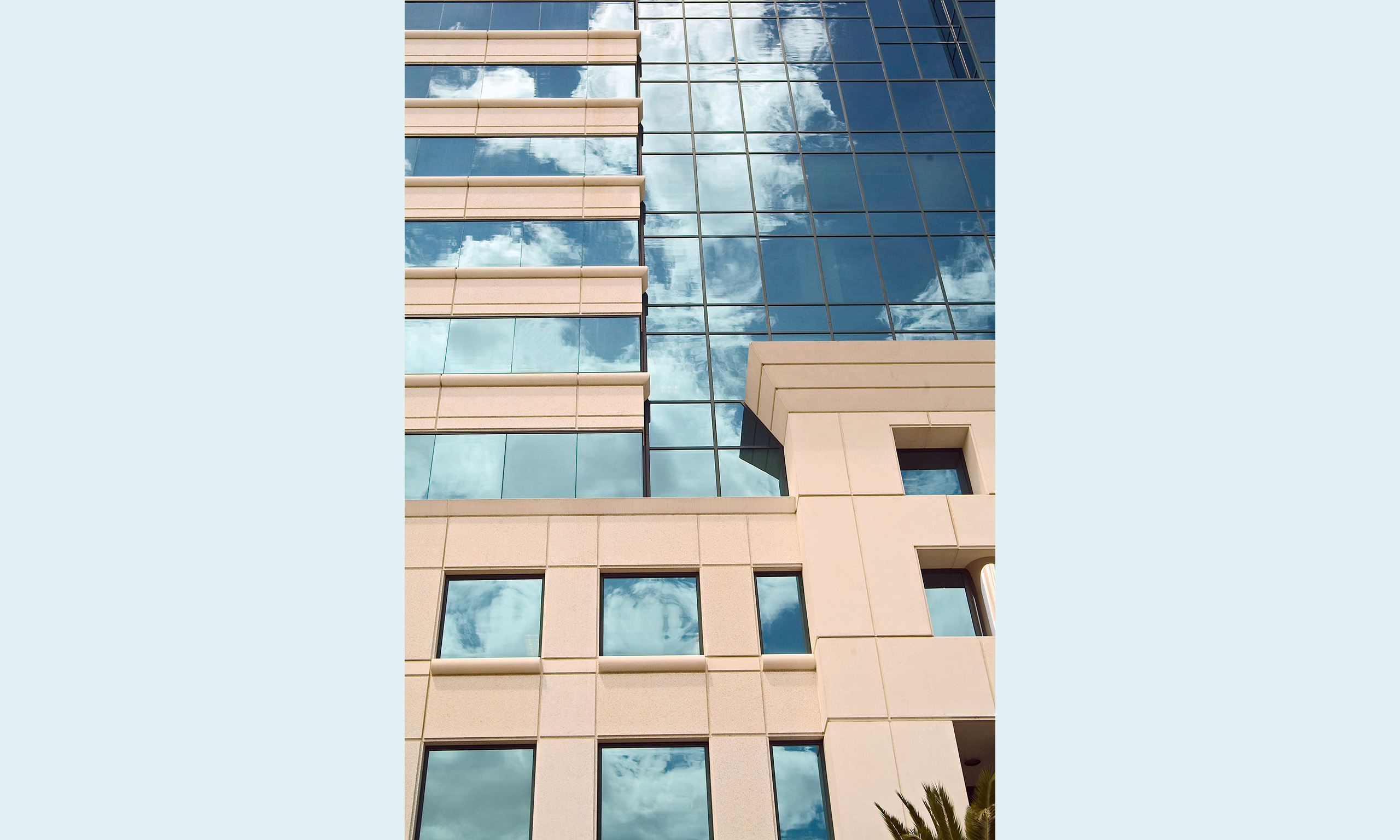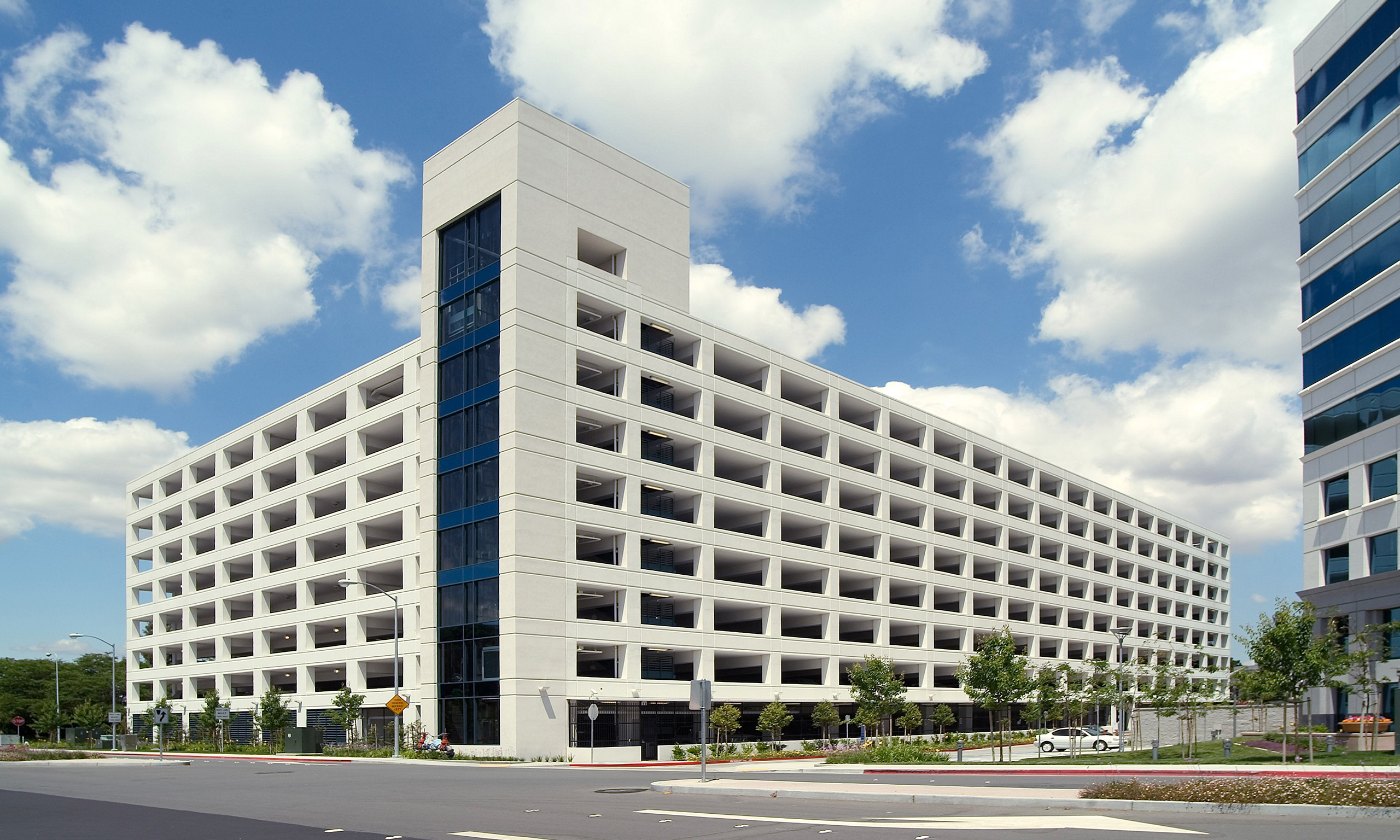Visible from a major freeway, the building and its nine-story parking garage were designed to be a Concord landmark. With its arctic blue, high performance glazing system, this unique structure will reflect ever-changing cloud formations in the cerulean sky above.