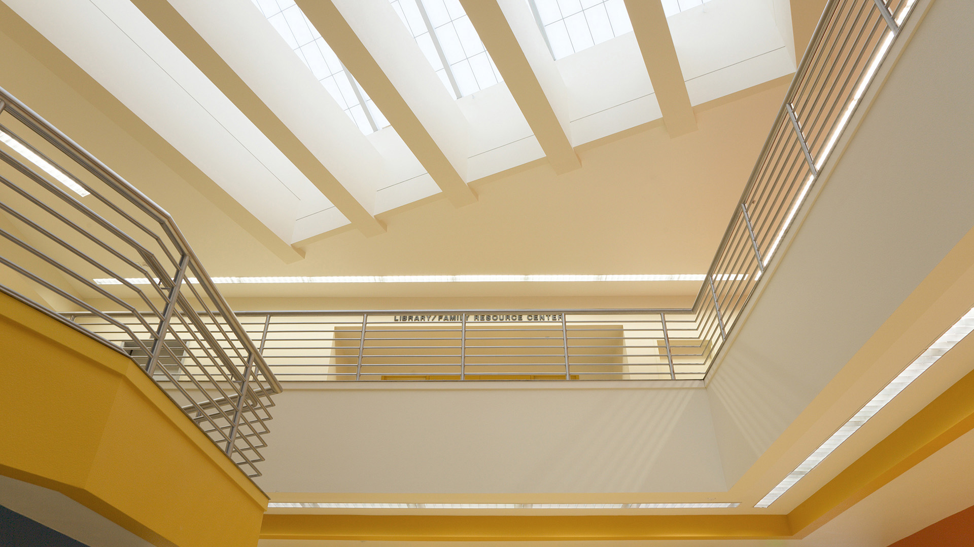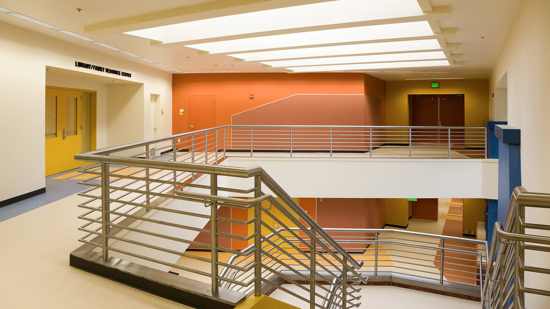 The compact 2-story building design allowed existing school facilities to remain operable during construction.  The vibrant color schemes are coordinated throughout the school and special ‘niches’ were made available for each grade level to showcase student artwork in the main entry area.  The art and music classrooms are conveniently located near the theater and multi-purpose area.
