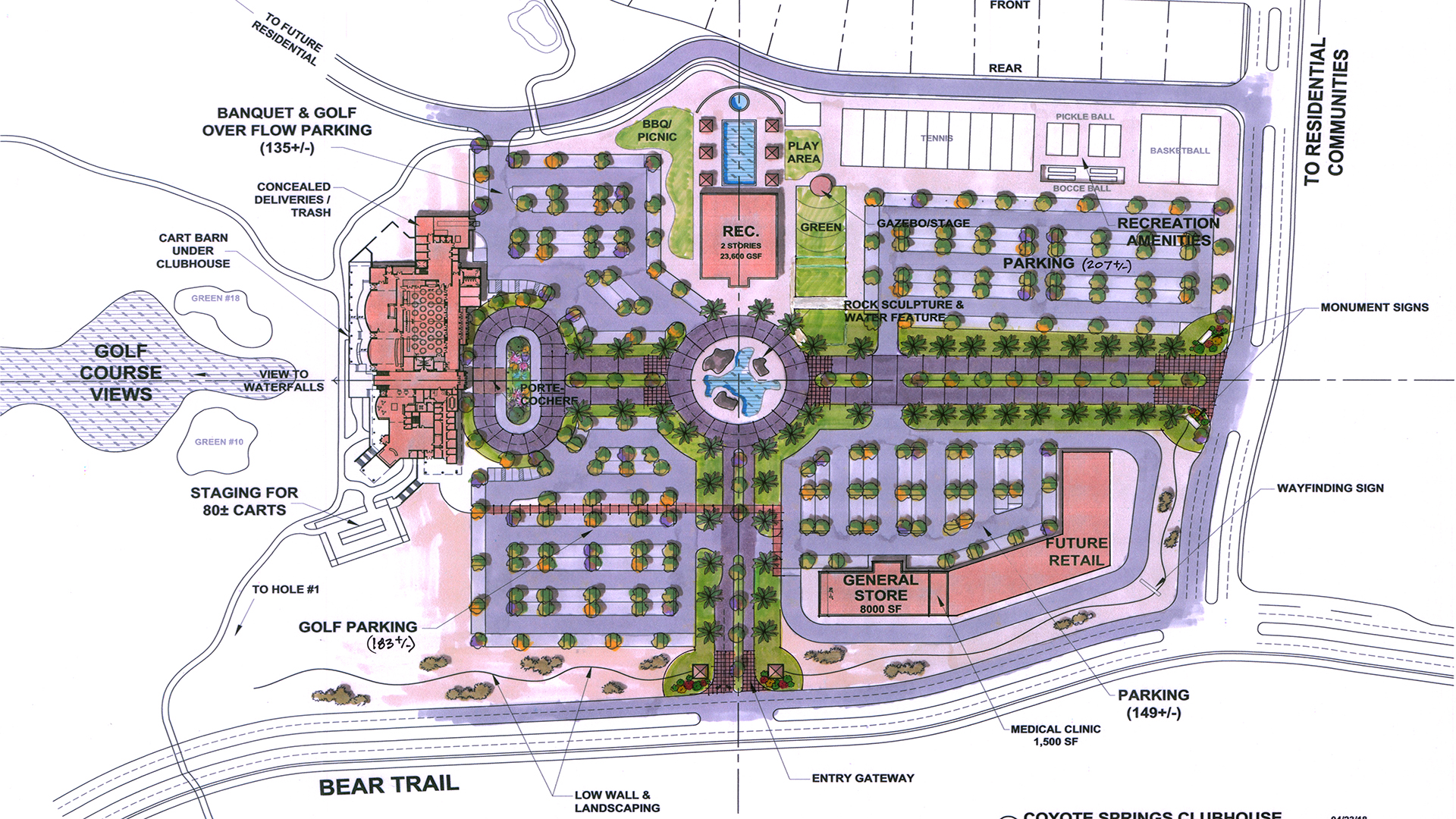 LCA Architects is currently designing a golf clubhouse and event center as a future centerpiece for the residential community of Coyote Springs, Nevada, with construction expected to begin in 2020. Elements of the design package include the land plan for a town square and a two story, 30,000 square foot clubhouse in concert with the existing local facilities. A restaurant with bar and dining terrace, 250 parking spaces, an obscured delivery and docking area, lounge areas maximize views of the golf course and hills beyond, golf cart barn, a modern commercial kitchen is also included in the design.